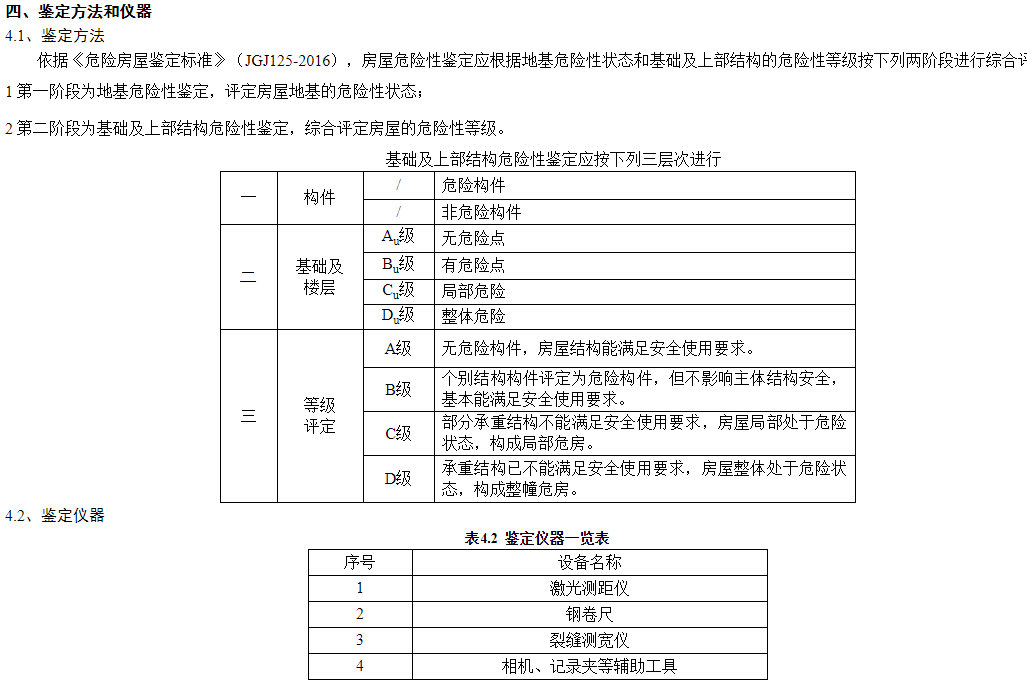 主要依據(jù)《危險(xiǎn)房屋鑒定標(biāo)準(zhǔn)》(JGJ125-2016),進(jìn)行房屋結(jié)構(gòu)現(xiàn)狀勘查和房屋變形觀測(cè),通過(guò)綜合分析進(jìn)行房屋現(xiàn)狀危險(xiǎn)性鑒定。